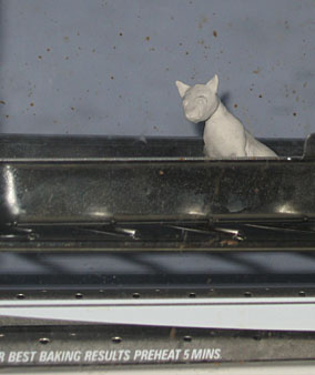 I tried to smooth him out some, though you can’t really tell! Then Creepy Meow was off for some quiet time in the toaster oven. (at a comfy 275 degrees!)