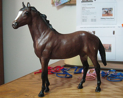 She needs loads of work. I think she got dragged around my a dog (or a crazy child) before I found her at a yard sale… there are holes in a couple of her legs. I think I’m going to get rid of that mane and tail, and attempt to add some more definition to her face… or something! Have no idea what color she’ll end up being yet. 🙂
