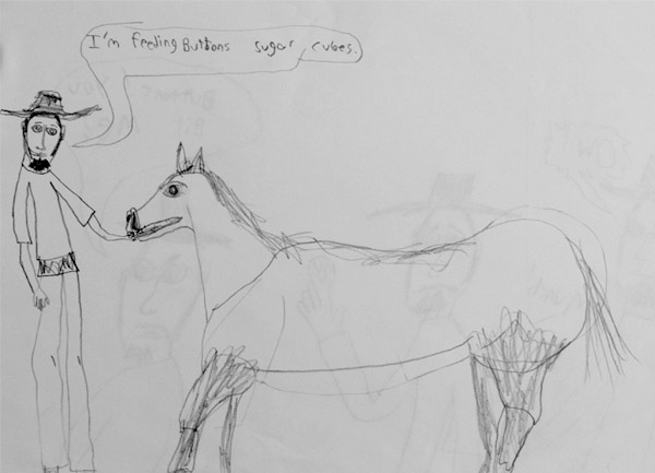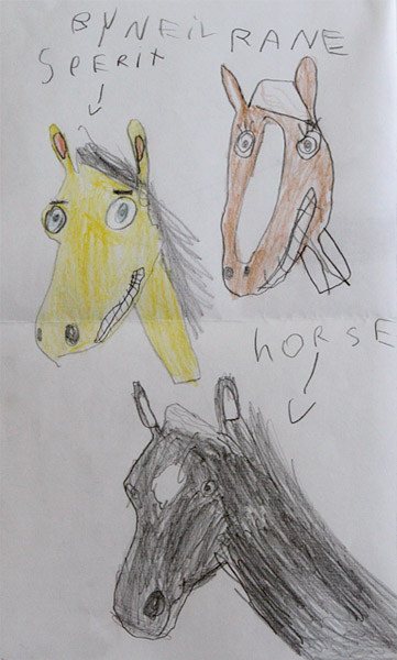 My youngest brother, Neil, is fascinated with the things I make for my horses. He was really interested in the barn I was building a couple years back, and was always coming up with ideas for things to add to it. He’s also suggested names for my horses and asks if I’ve gotten a new one whenever there’s an empty box in my room. (Caught! Dang!) He ended up drawing me a few pictures of horses too: