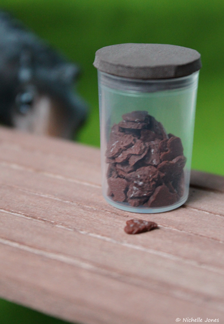 Cookies2They were individually sculpted in clay and shaded with pastels. The “oats” were painted on afterwards, but it would probably be best to mix in pre-baked clay shavings (or something) beforehand.