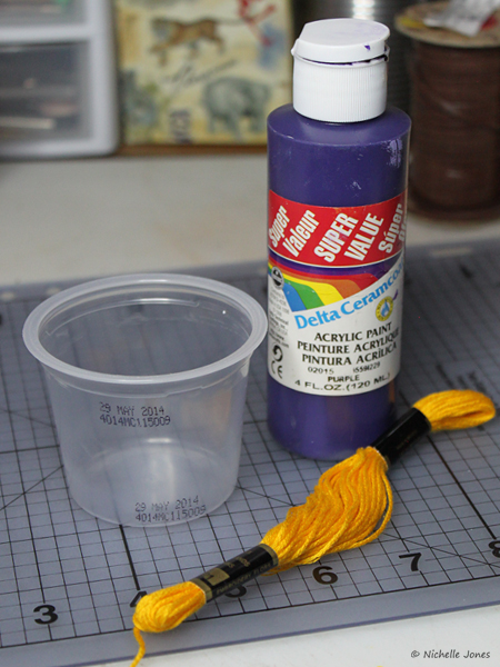 The handles were made by splitting a piece of embroidery floss in half, (my floss is made up of six individual strands) then twisting it together. I punched holes in the side with a tack and threaded the twist through with a large needle.