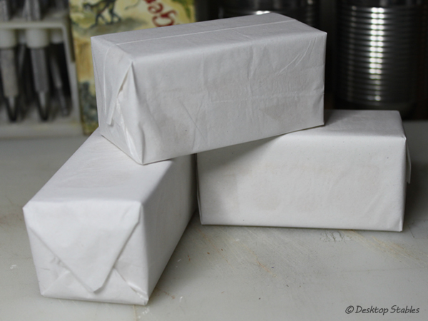 Instead of a milk carton, I used pieces from that Breyer box I still haven’t thrown out. (there’s not much left to throw out now, ha!) These were folded up, taped together and stuffed with pieces of scrap paper to give them a little more weight.