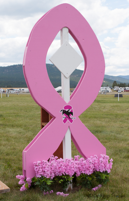 Two large pink ribbons mark the end of the course. The pink ribbons everywhere are for an initiative called Halt Cancer at X, to raise money for breast cancer research.