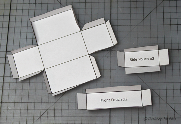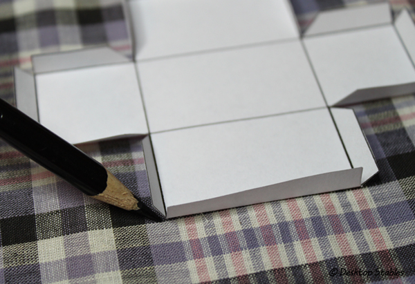 First, you’re going to want to cut out the pattern pieces and fold all the grey shaded tabs inward, like so.