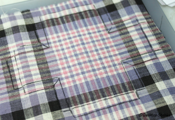 Transfer the pattern to the wrong side of your fabric of choice. One way to do this is to trace around the shape without the tabs, then fold those down and trace around them. Or, you can trace around the entire piece, then free-sketch the tabs back into place. Clear as mud?