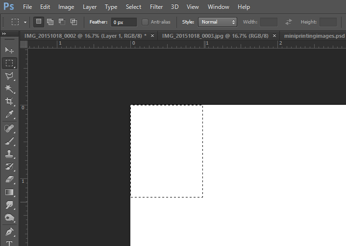 There are multiple ways to do this, but my preference is to start with a solid color shape in the size I need. This is where rulers come in handy… here I’ve made a selection in the very top corner of my document, using the rulers on the side as a guide. This can be filled with any color.