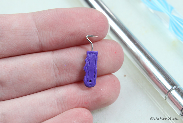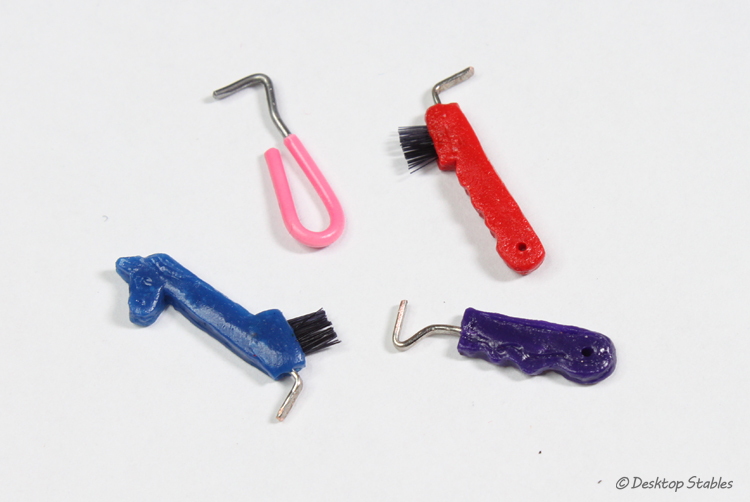 The easiest way to make a basic hoof pick is from a paperclip. I use the colored plastic-coated ones but they can also be made from the plain ones as well. When I was younger I would make them from the silver clips, then dip the “handle” into paint to give it color.