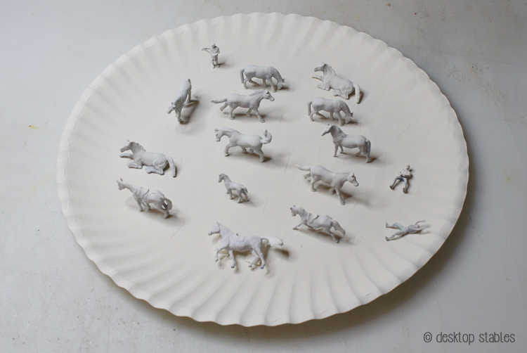 I am in the slow process of repainting a bunch of HO Scale horses. I wasn’t satisfied with their original paint jobs, so after sticking them to double-sided tape, I gave them all a blast of primer. That was uh… a couple months ago?