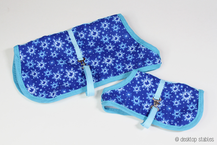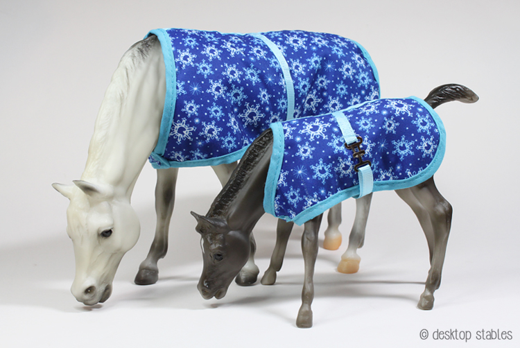 The mare’s is cut very deeply to fit around her chest, so it doesn’t fit other models quite as well. Both blankets are sewn together in the front, but I might take those stitches out and add another strap. I haven’t decided yet. I’ve already taken the Breyer tag off like I’ve done with all my Breyer blankets… I kind of wish they would stick that on the inside but oh well! 🙂