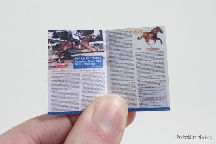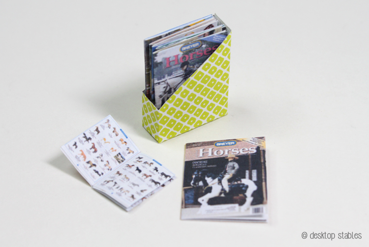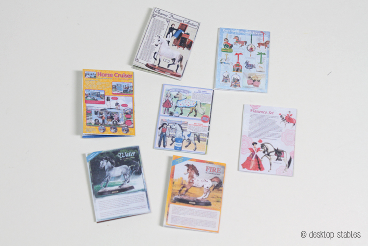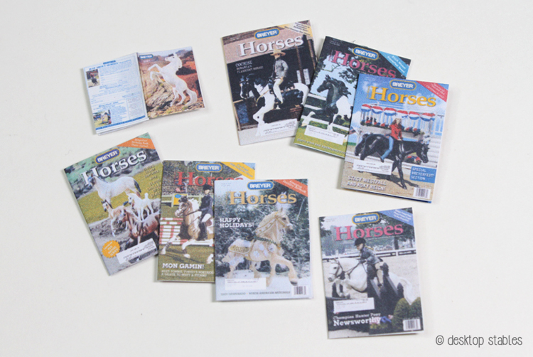 I haven’t been in the mood for tack/sewing, but I did manage to finish up some printables I had on my PC for a while. These are some of my JAH (Just About Horses) magazines, scanned and miniaturized in Photoshop. I also threw a box catalog and a template for a magazine holder in there as well.