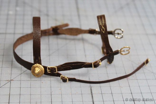 The crown piece is split, which is always a bit stressful (for me anyway!) as it can go wrong so easily. Mine isn’t exactly how I want it either… since I used two different buckle sizes on the cheek and throat pieces, I tried to cut the lace in the correct widths to match that. I came close, and everything buckles ok, but the hardware is really rough on the lace because it’s not exact. I doubt I could get it exactly right, but it’s something I need to pay closer attention to in the future.
