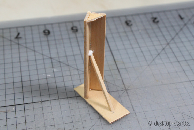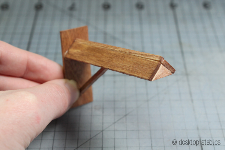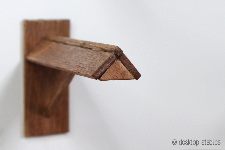 Add glue to the angled ends of the remaining matchstick. Glue one end at the second mark, and the other underneath the rack. I like to add a drop of glue there as well, to make sure it will stay in place.