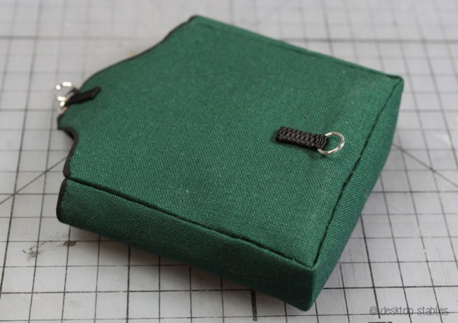 Your bag is finished! To make a simple hanging strap, glue a jump ring to one end of a piece of ribbon, and a hook to the other. (this one is from Rio Rondo but you could bend one out of wire if you’d like)