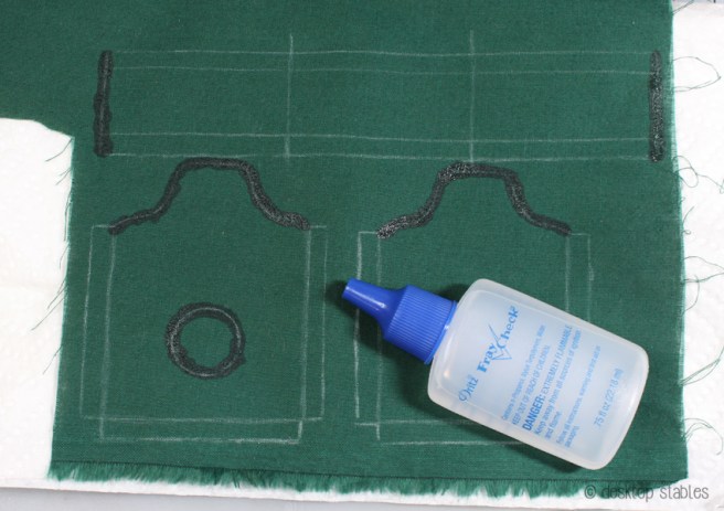 With Fray Check, go over the lines of the round opening, top edges of the bag and short edges of the long piece, then let dry completely. This will soak through the fabric so make sure you have something underneath! Fray Check can darken some fabrics, so it would be a good idea to test a scrap piece first.
