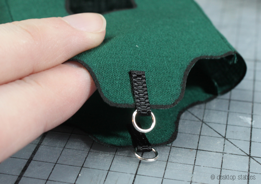With the third ribbon piece, fold over one end, add a jump ring and glue in place. Fold and glue the excess, then glue to the back of the bag. On real hay bags, this ring is to add extra support to the bag when it’s tied up. On the model ones it’s just an extra detail, but it could be used if you wanted to. 🙂