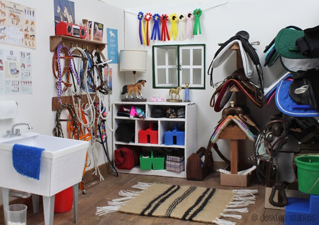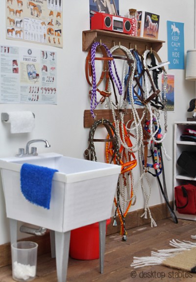 The floor was made from large popsicle sticks, and the walls were covered with white poster board. I’ve posted tutorials on how I made the saddle and bridle racks, and since then I’ve added a utility sink…