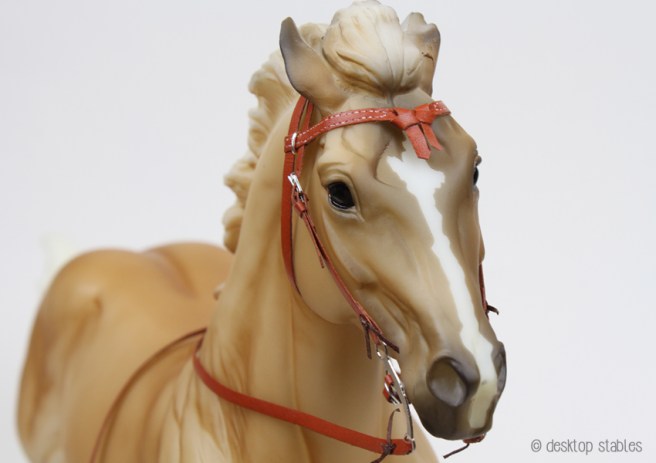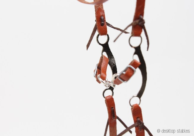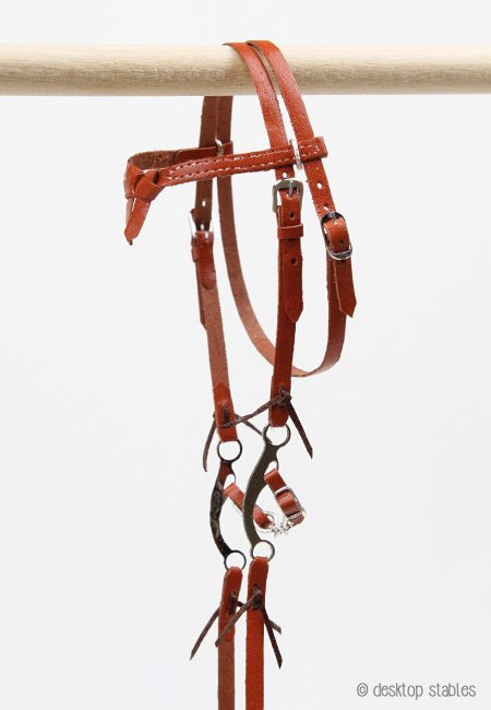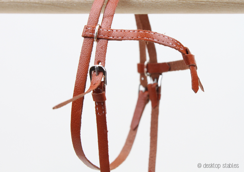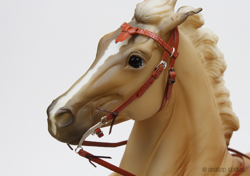 I’m attempting to make at least one tack piece every month this year. This weekend I had time to put together the first, a western bridle made to fit Breyer’s “Wyatt” mold: