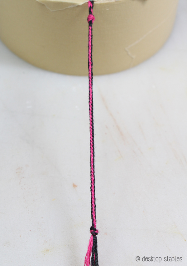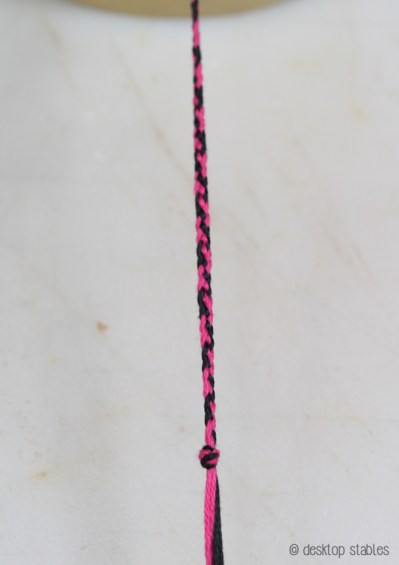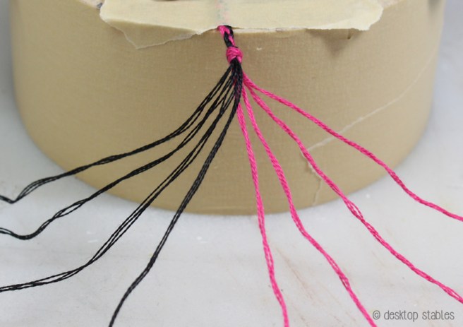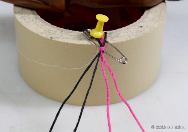 Knot together at the top, then separate the four strands. In my first attempt, I split each strand into two, so I had four strands with two colors in each – if that makes sense?