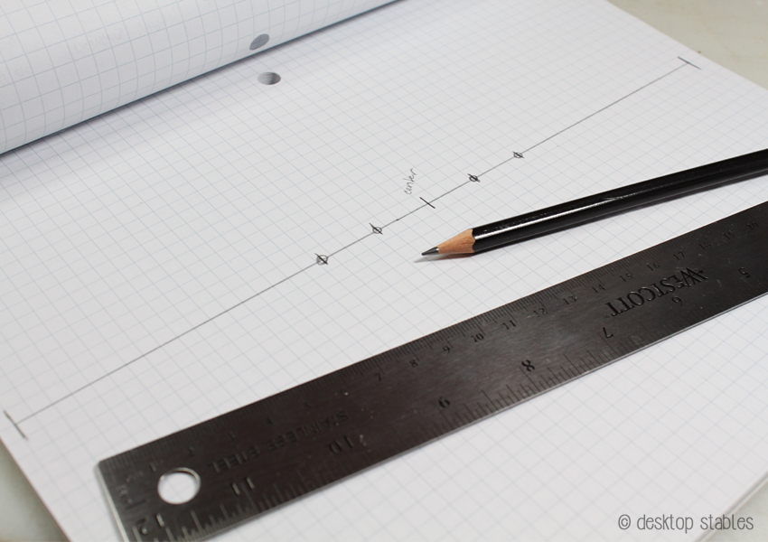 A common length for full-size barrel reins is 8 ft. In 1:9 scale, this is around 10 1/2 inches. To start, draw a 10 1/2 inch line on a piece of paper. Make a center mark at 5 1/4 inches. From the center, add two more marks at 2 cm and 4 cm. Repeat on the other side.