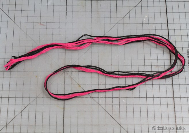 Because it’s better to have more than not enough, measure a 12 inch piece of embroidery floss, then double it to make 24 inches. Cut two of these in one color, then two in the second.