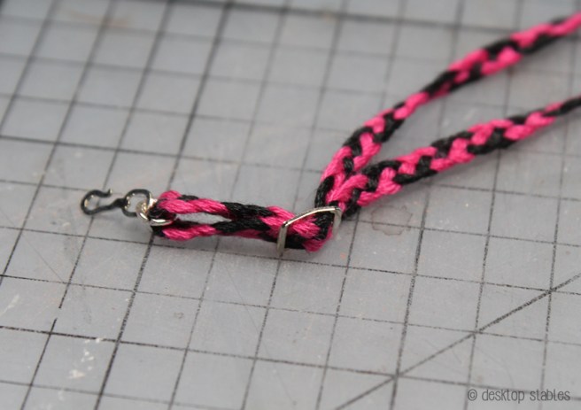 Thread on a buckle, bottom to top. (if you’re using etched hardware, bend the buckles slightly beforehand) Add your jump rings/hooks, then fold over your braid and thread it back through the buckle.