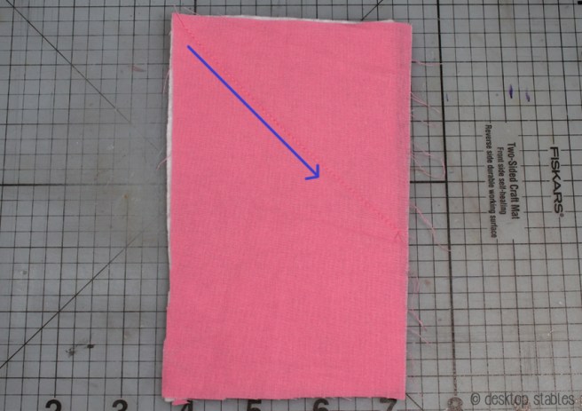 To start, sew a diagonal line starting at one top corner. If you like, you can draw this in with chalk and a ruler. (it will not go corner to corner unless your fabric piece is a perfect square)