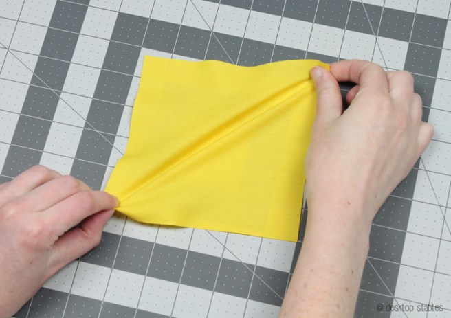 Start by taking one corner of your fabric, then fold it diagonally to meet the other side. You want a 45° angle here. Unless your fabric is a perfect square, it’s not going to fold in half exactly.