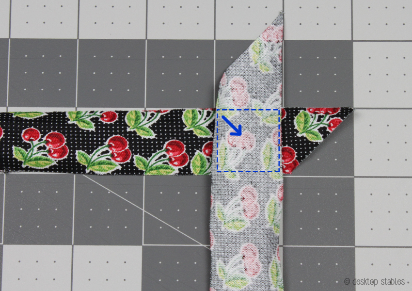 Start by laying one piece of bias down, with the good side facing up. Take your second piece and lay it on top (wrong side up) so the pieces are perpendicular to each other. (if your tape is folded open the folds up first)