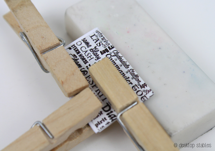 Once that was dry, I used one to cut several rectangles from scrap paper. These got stacked together so a top and side edge was flush, (if that makes sense…) and held together with clothespins.