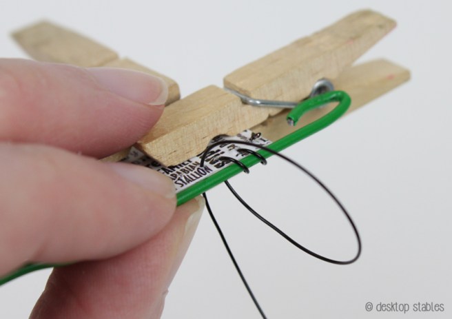 I used a very thin beading wire to loop through all the holes. The green piece is an unfolded paperclip, which is helping keep the loops even.