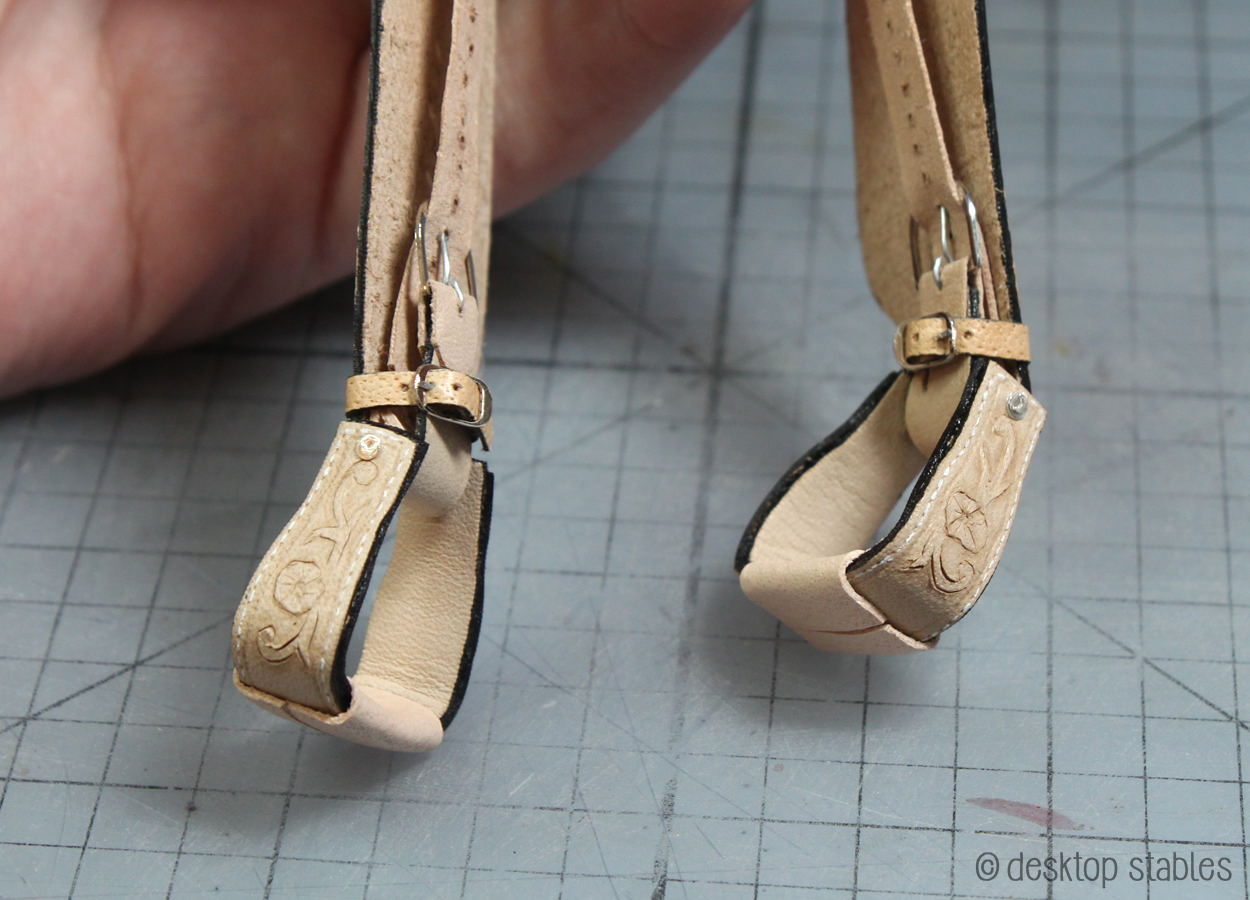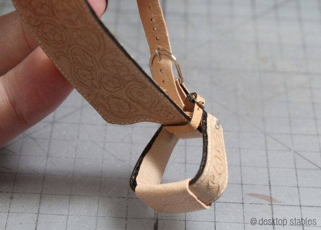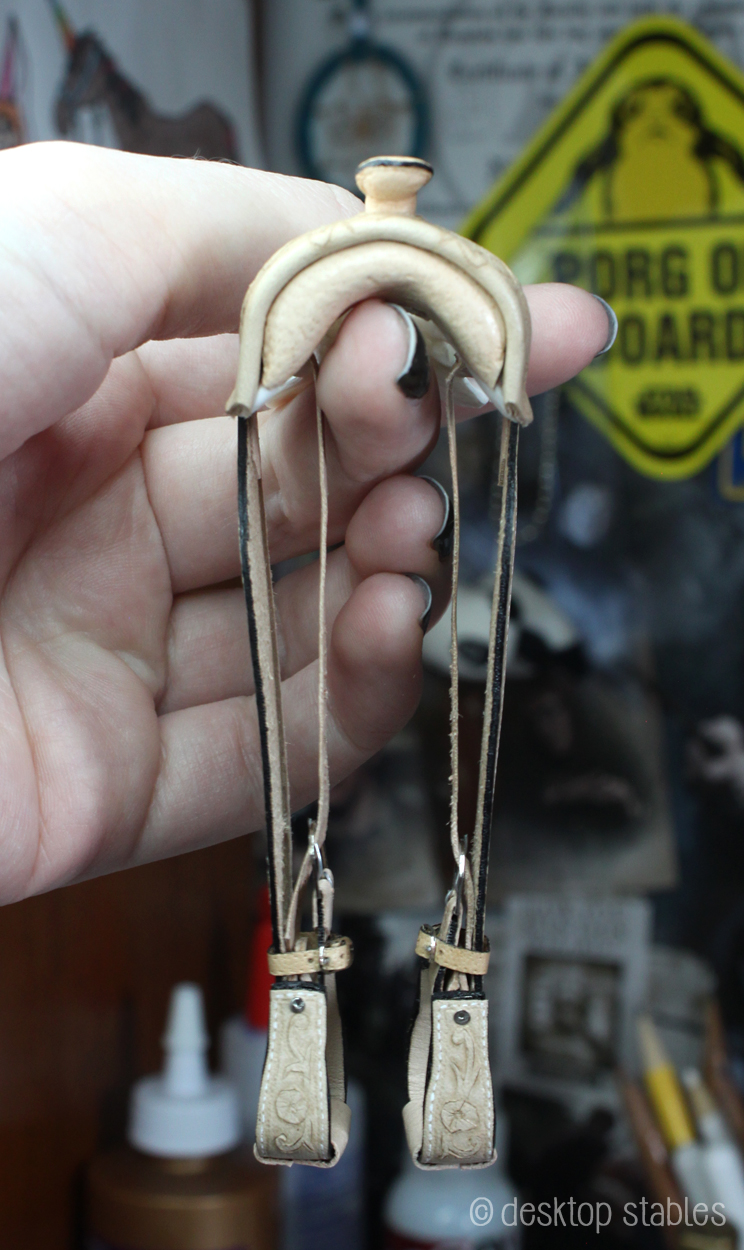 A lot of western saddles use a blevins buckle on stirrups. I know someone in the hobby made these once but it was so long ago that I can’t remember who! I wasn’t brave enough to figure that out so I opted for a simple dee ring buckle instead.