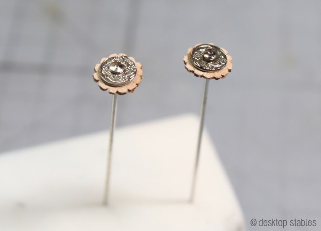 Once I was happy with how it looked, I stuck a straight pin through the center, pushed it in an eraser and gave it a coat of gum tragacanth. Later I added a coat of sealer, then the tinest amount of Edge Kote along the edges.