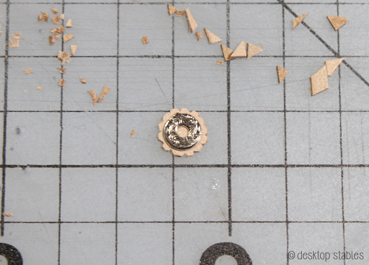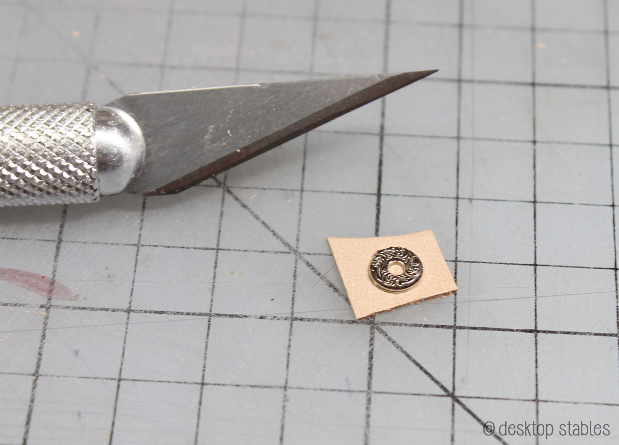 I started by sticking my concho onto a piece of skived tooling leather. I used a couple drops of tacky glue to hold it in place. I didn’t want it to be permanent in case I needed to start over: