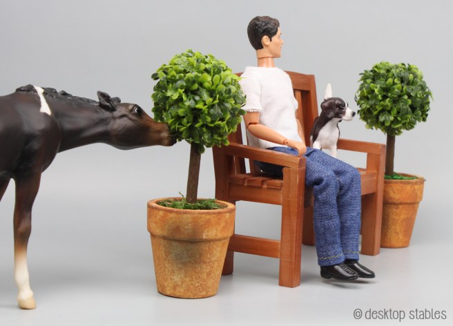 I didn’t have any say in the other accessories, but they’re super cute. You get a wood bench, and two potted plants. I can see them being used with a jump too.
