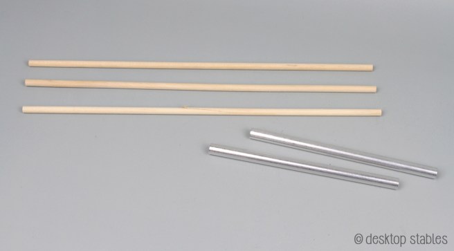 The set comes with three wood dowels and two metal tubes they can slide into. To fit the large barn, connect all three dowels with the tubes, and for the smaller two stall barn, only connect two. The drapes slide on like curtains. 🙂