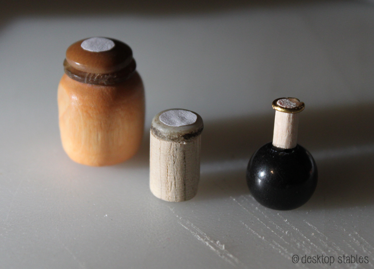 These started out as beads, buttons and tiny pieces of wood. The “Worm’s Wort” bottle isn’t movie accurate, but I really like the shape so it doesn’t bother me too much.