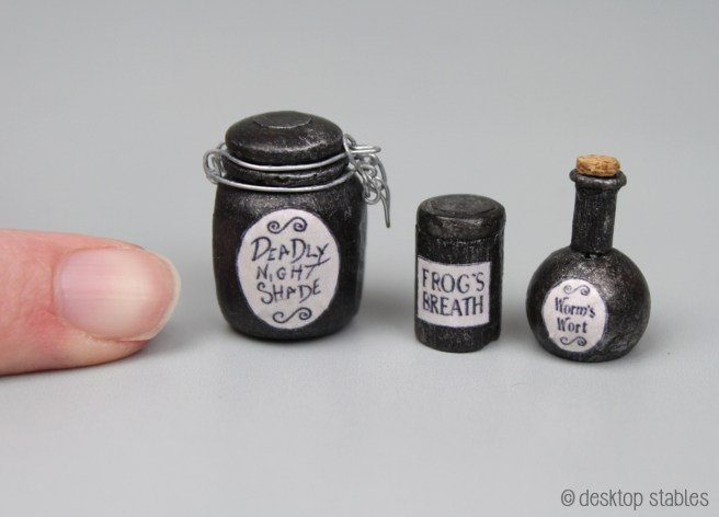 I gave them all coats of black paint, then dry brushed them with silver. The Deadly Nightshade jar got a wire fastening added to it, and while it’s a little bulky and was super fiddly to make, I’m happy I decided to make it. (I can’t say I want to do that again though, haha) The labels I found online and resized in Photoshop.