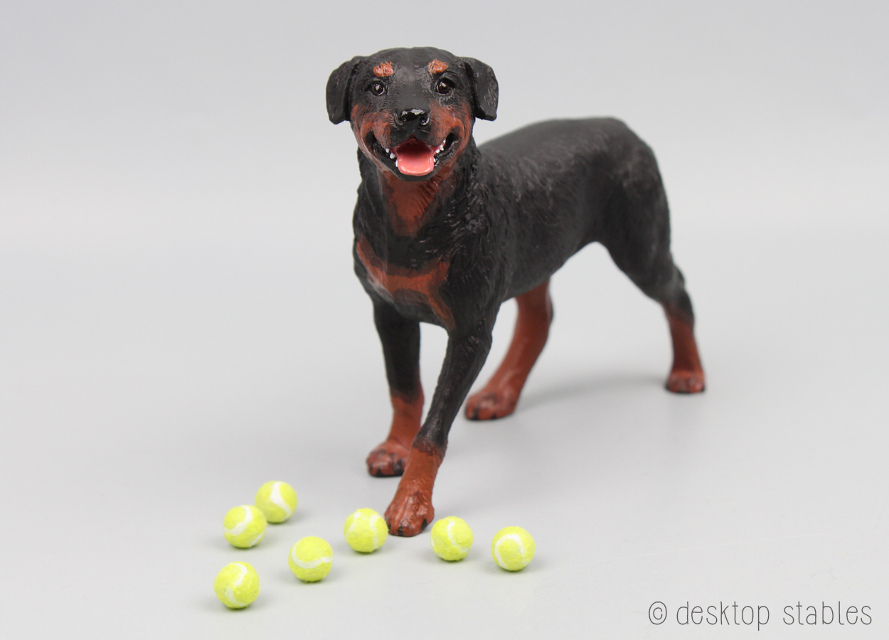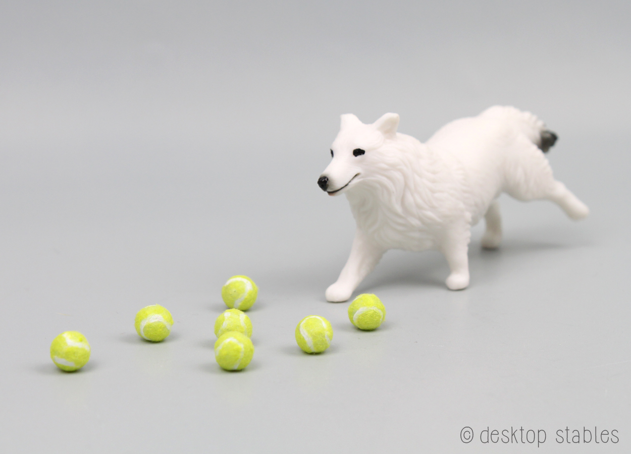 The tennis balls were made by covering tiny balls with flocking. I made it by combing out green yarn and cutting it into a fine powder. Pro tip: wear a mask while doing this!