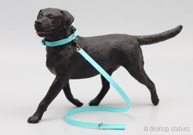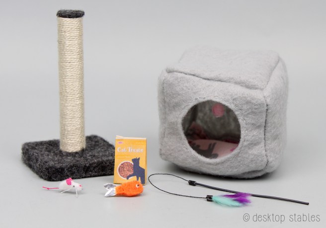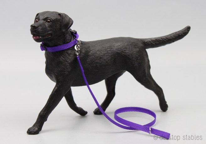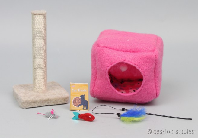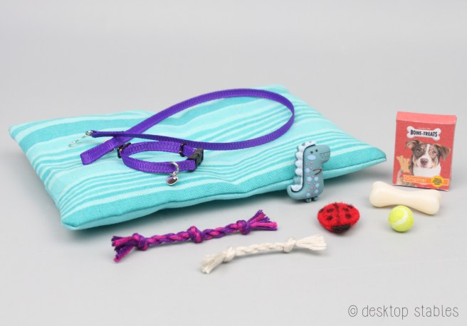I also have five dog sets. These include a pet bed, dog collar and leash, a treat box, and an assortment of toys. The collars were built on Breyer’s Labrador mold. They are slightly adjustable but fit the bigger dogs best. These sets are also priced at $25 each.