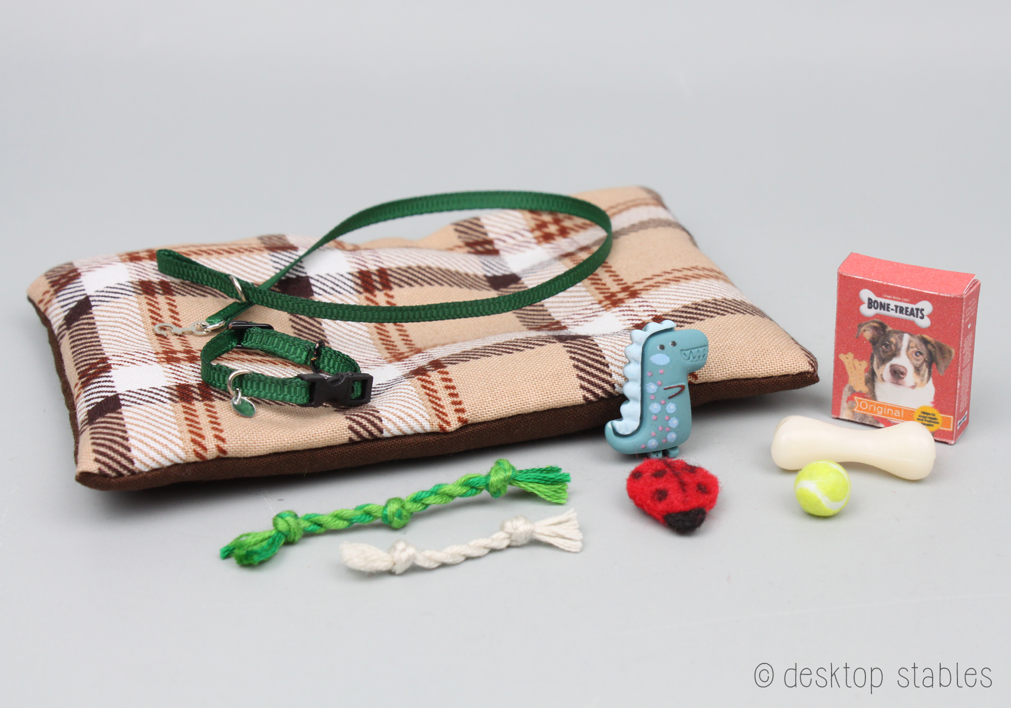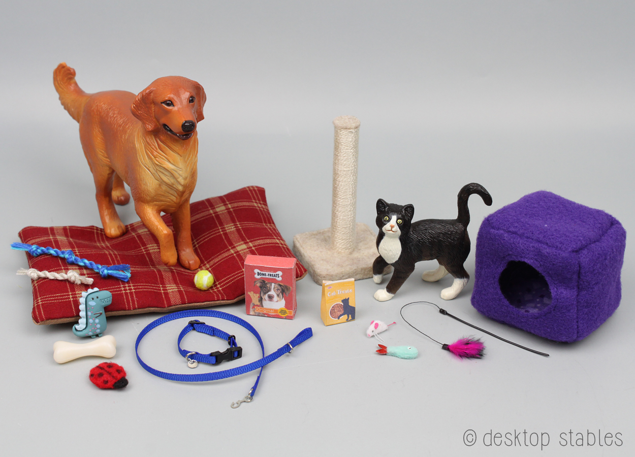 I also have five dog sets. These include a pet bed, dog collar and leash, a treat box, and an assortment of toys. The collars were built on Breyer’s Labrador mold. They are slightly adjustable but fit the bigger dogs best. These sets are also priced at $25 each.