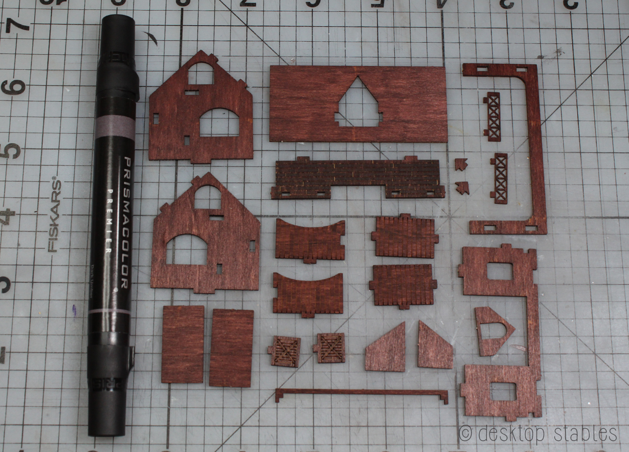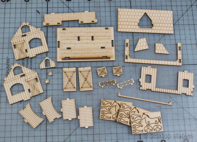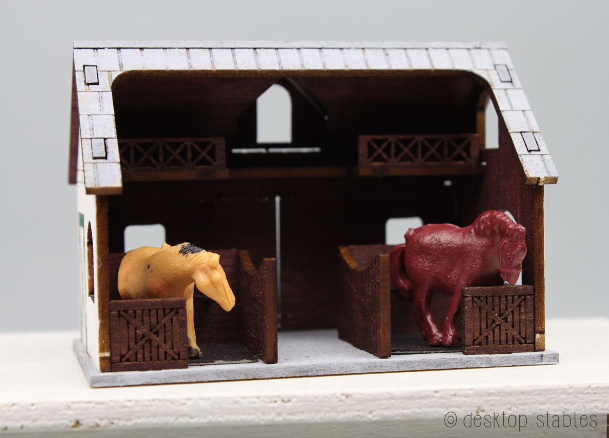 One everything was dry, it was finally time to assemble! I added extra pieces at this time, like the stall mats and the feeders, cut from the wood scraps.