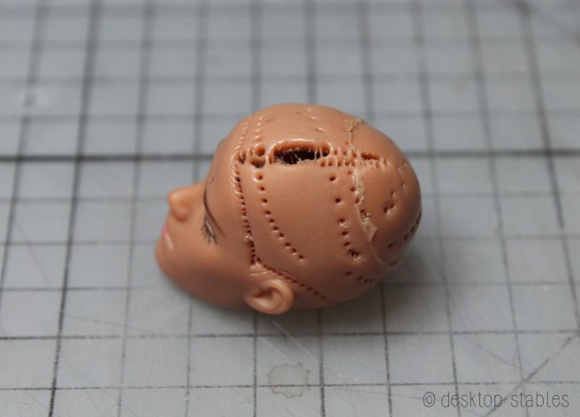 I had planned to re-root her with viscose. I’ve done this a couple times with Breyer dolls so I was feeling pretty confident until I got all of the old hair removed. I don’t know if it was this release of Yvonne or what, but my doll has a very hard vinyl head. The factory rooting left rows of holes that were too small for a needle/re-rooting tool, and a lovely gap in her skull where the plastic had separated.