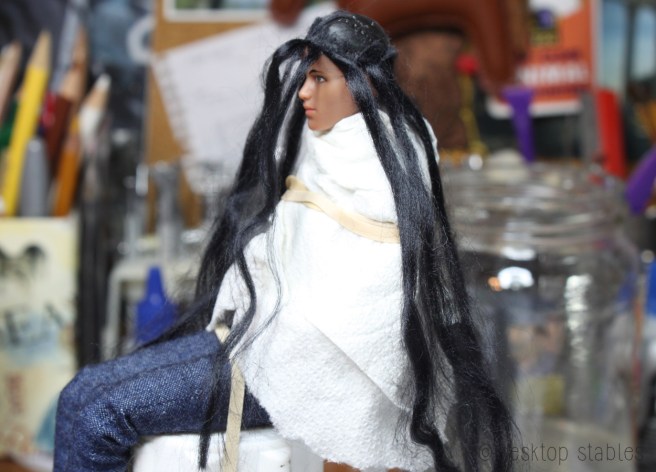 … so it would look smooth when flipped over. I added a little more to her head to add some more volume, (and hide bald spots, lol) then tied it back in a low ponytail. I also gave it a light coat of watered down glue to help tame the frizz. (this stuff gets everywhere!)