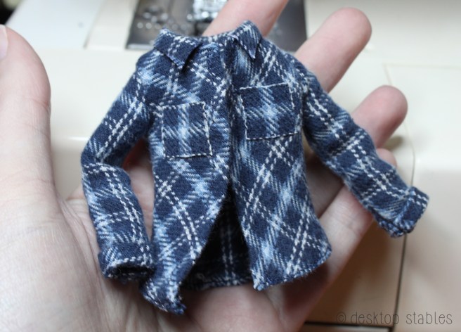 This was necessary to reduce bulk, as I wanted her to have a flannel shirt layered over it. This shirt I made using the same pattern I had used for the t-shirt, but backwards so the opening would be in front. (it’s a free Barbie pattern I found and resized. Not perfect but it’s a starting point) Like the jeans I had to make some modifications to the length of the shirt, the sleeves and neckline.