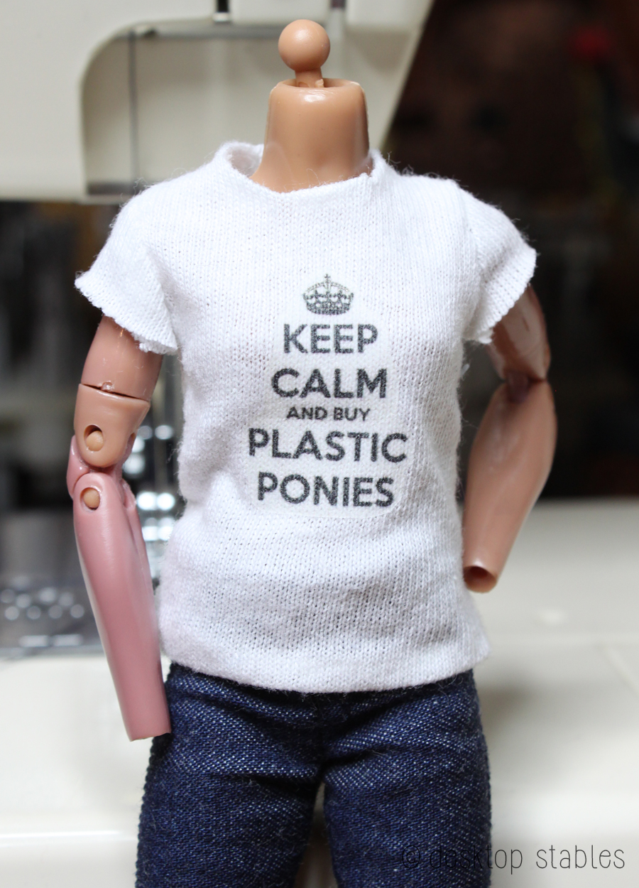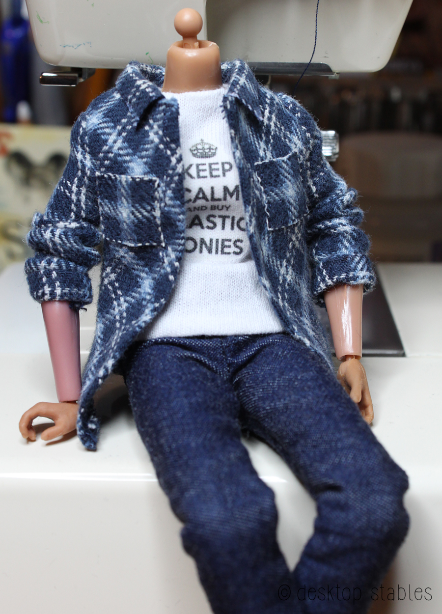 This was necessary to reduce bulk, as I wanted her to have a flannel shirt layered over it. This shirt I made using the same pattern I had used for the t-shirt, but backwards so the opening would be in front. (it’s a free Barbie pattern I found and resized. Not perfect but it’s a starting point) Like the jeans I had to make some modifications to the length of the shirt, the sleeves and neckline.