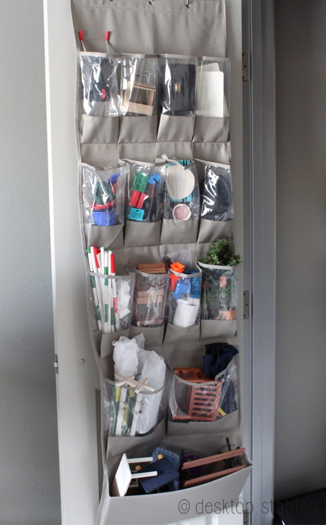 Something else I needed to tackle was the Tower of Shoeboxes that held all of my larger props. The closet in this room is fairly small, but it does have space for an over the door organizer, which I also picked up from Target. I liked this one because the pockets are clear and are larger on the bottom, for my bigger, more awkward pieces.