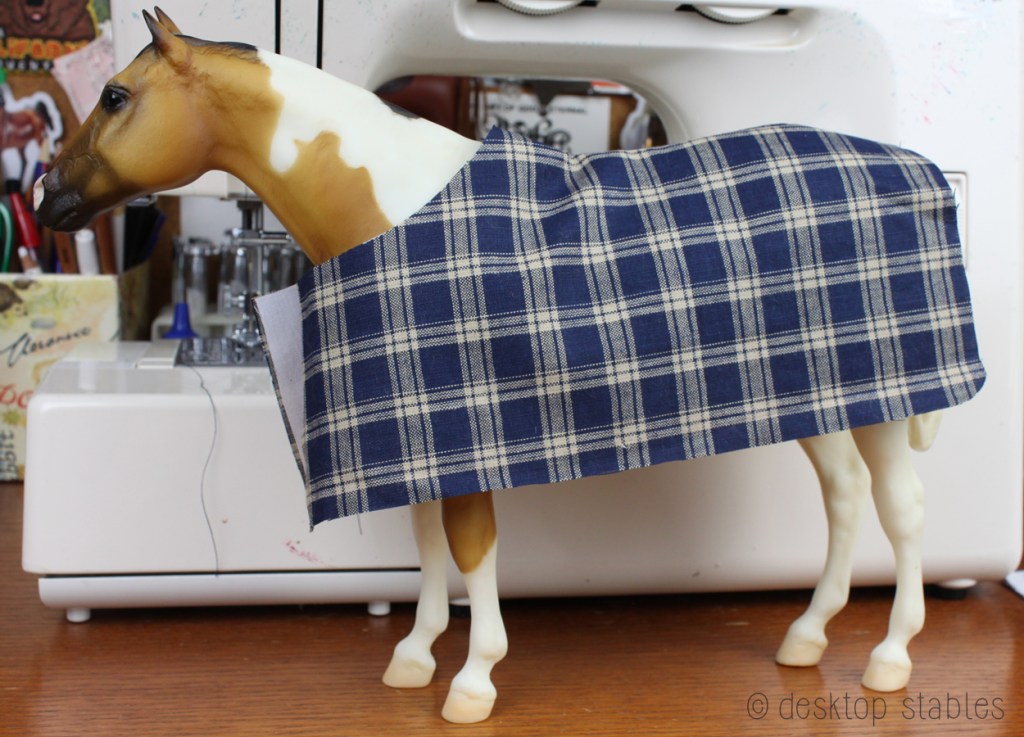 Once this is done, I’ll continue to fit the blanket by trimming the front, rounding the corners and trimming the neckline as needed. On some models, I’ll cut the neckline back by the withers to fit around sculpted manes, like I did for this one: