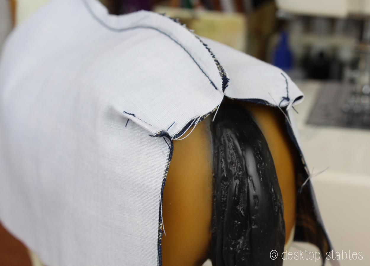 This seam follows the curve of the horse’s back. Every model is different, so this line is adjusted as needed. Sometimes it curves higher or lower towards the end, or doesn’t curve much at all. If it’s not looking right on the horse, I’ll try again. Remember, stitches can be taken out!