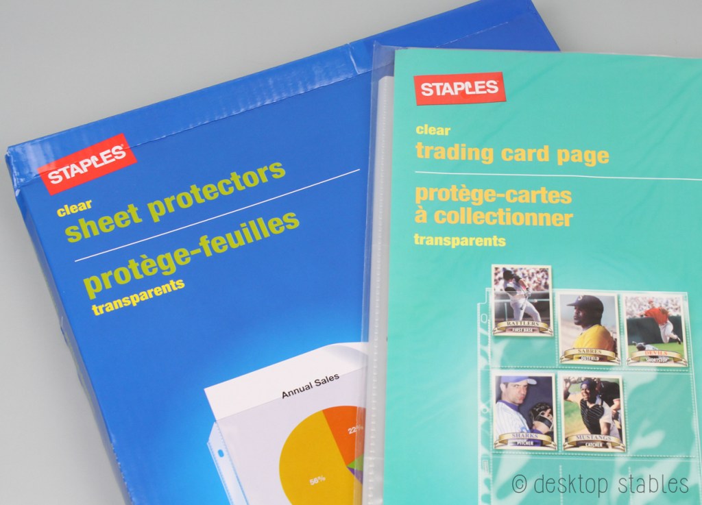 So I picked up a package of full-size sheet protectors, some for trading cards, and two 3″ binders.