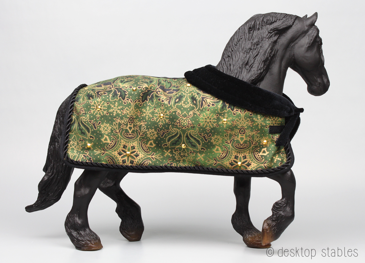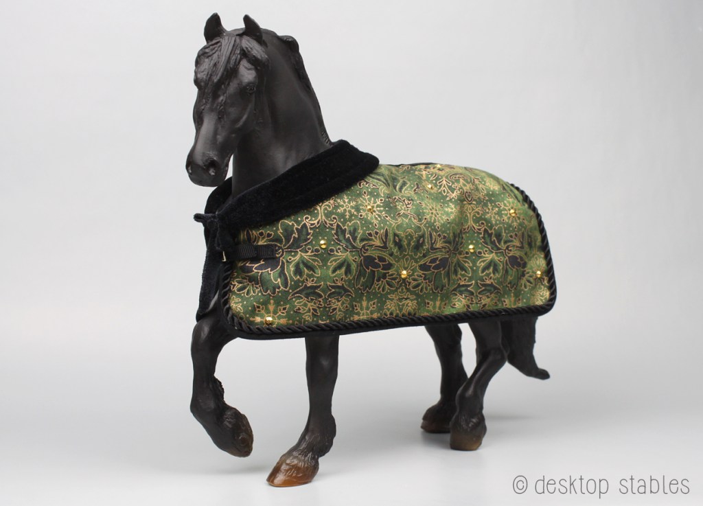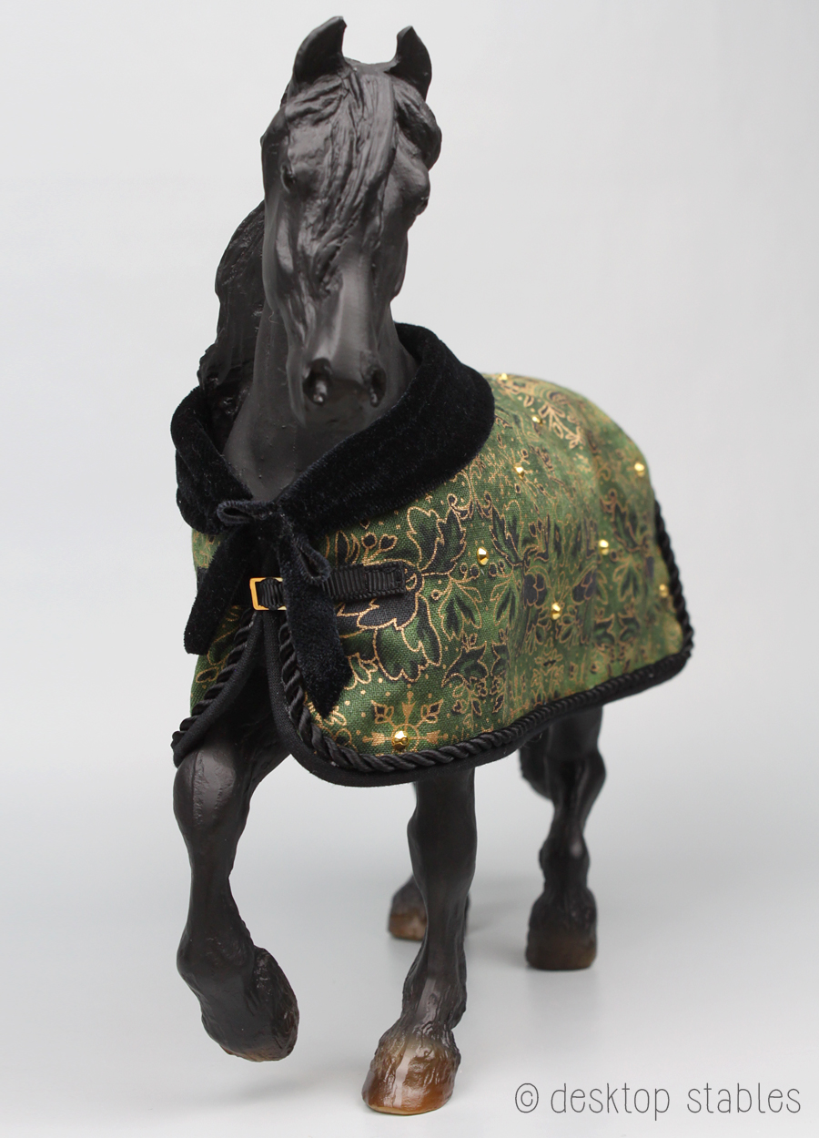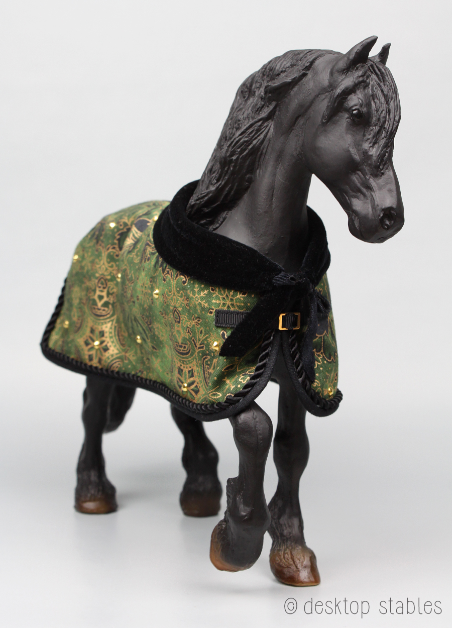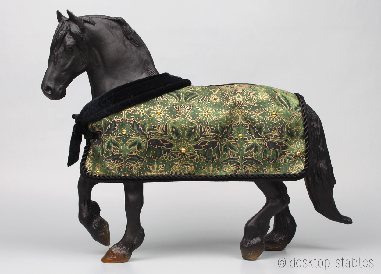 This piece of green and gold fabric had been in my stash for a while. I love the gold snowflake pattern and thought it would be suitable for my Friesian model. I tried to switch things up by making less of a typical horse blanket and more of a costume-ish type of thing.